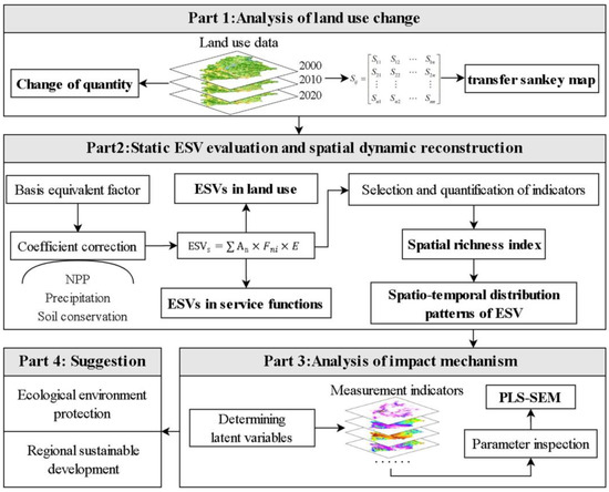 As shown in Figure 1, the research framework consisted of four parts. Firstly, the spatiotemporal evolution and internal transformation of LULC over the past 20 years (of the study area, see Section 2.1) were analyzed; secondly, the modified equivalent coefficient and spatial richness index were used for static calculation and dynamic reconstruction of ESV in 2000, 2010 and 2020, respectively, to dissect the spatiotemporal patterns of ESV and its responses to LULC; thirdly, the Structural Equation Modeling (SEM) was used to quantify the driving mechanism of ecological-economic factors on ESV. Then, the strategies of ecological environmental protection and regional sustainable development were proposed in the end.