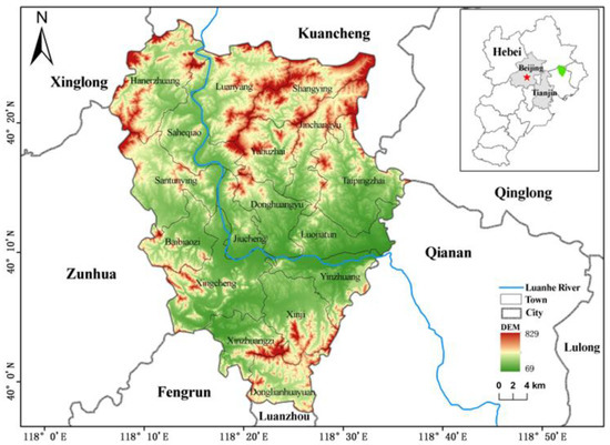 Qianxi County, located in the Beijing-Tianjin-Hebei Economic circle, is a typical mountainous and hilly area in the northeast part of Tangshan City with a geographical coordinate of 118°6′~118°37′ E, 39°57′~40°27′ N (Figure 2). The terrain feature is high around and low in the middle. The rivers there crisscross and the water resource is rich, in addition to the Luan River and its tributaries, the two famous reservoirs, Daheiting Reservoir and Panjiakou Reservoir, guarantee the municipal water of Tianjin City and Tangshan City. It is honored as “Hometown of Chinese Chestnut” and the largest H-shaped steel production base in China, with iron ore reserves of 470 million tons. In recent decades, the extensive economic development model accompanying with the drastic sprawl of chestnut economic forest and mining land makes it a sensitive and fragile ecological economic zone.
