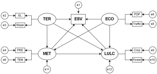 The Structural Equation Model (SEM) was constructed here to quantify the complex pathway relationships and interactions between ecological-economic factors and ESV. The SEM was composed of a measurement model and a structural model. The measurement model was used to measure the covariation relationships between latent variables and observed indicators, and the structural model was used to reveal the structural relationships of latent variables. Relative published research has proved that there is a causal relationship between ESV and LULC, natural factors, and socio-economic factors [28,33], so economic development (ECO), meteorological conditions (MET), terrain factors (TER), and LULC were selected in this study as the four latent variables in the model. Population density and distance to the highway were used to indicate the latent variable ECO; total annual precipitation and average annual temperature represented latent variable MET; elevation and slope were selected to represent the latent variable TER; the manifest variables of LULC were forest area and cropland area. Then, the relevant hypotheses (Table 5) were proposed, and the SEM theoretical model (Figure 3) was constructed.