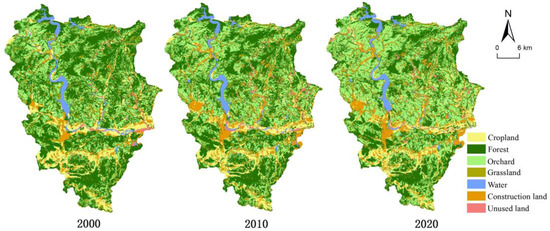 Forest and orchard land were the two primary land use types in Qianxi County (Table 6). In 2000, forest land as the largest proportion of land use types constantly shrank, while orchard land continually expanded and was similar to forest land by 2020. The change rate of forest and orchard land was −35.01% and 28.84%, respectively. The cropland decreased first and then increased slightly, from 14,845.89 hm2 in 2000 to 13,245.97 hm2 in 2010 and then climbing to 13,742.86 hm2 by 2020. Grassland constantly decreased from 5879.34 hm2 in 2000 to 4851.64 hm2 in 2020. From 2000 to 2010, the construction land sprawled dramatically with a growth rate of 46.6%. The change rate of all land use types from 2010 to 2020 significantly decreased compared with that in the previous decade, which was highly correlated with the resource exhaustion conditions and the implementation of the Ecological Civilization Strategy in recent years.