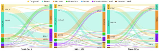 The land use transfer matrix, which reflects the evolution direction and degree of various land use types, is an important method for quantifying the structural changes in land use during the study time period. In this study, spatial overlay analysis completed in ArcGIS 10.6 was used to create three land use transfer matrices: 2000–2010, 2010–2020 and 2000–2020. These matrices were then visualized to obtain the final land use transfer Sankey map.