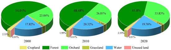 The total ESV of Qianxi County was 3257.56, 3146.4 and 2971.13 million CNY in 2000, 2010 and 2020, respectively (Table 7), and it has decreased by 8.79% in the past 20 years. The proportion of ESV composition in land use type from high to low was that forest > orchard > water > grassland > cropland > unused land and this order had no change in the 20 years (Figure 6). The ESV of forest, grassland and cropland decreased by 517.13, 19.41 and 10.81 million CNY, respectively, while the ESV of orchard increased by 254.5 million CNY, from 750.56 million CNY in 2000 to 1005.07 million CNY in 2020. The ESV change in water and unused land was little.