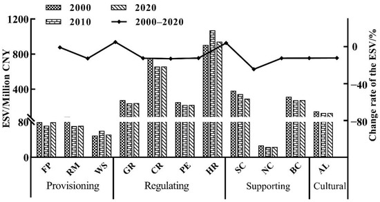 During the past 20 years, the most prominent ES in Qianxi County was the regulating service, followed by the supporting service, provisioning service and cultural service (Figure 7). Among them, the hydrological regulation (HR) function contributed the most to the total ESV of Qianxi County, followed by the climate regulation (CR) function. Soil conservation (SC), biodiversity conservation (BC), gas regulation (GR), environmental purification (PE) and aesthetic landscape (AL) functions contributed relatively more while food production (FP), raw material production (RM), water supply (WS) and nutrient cycling (NC) functions contributed less. In terms of variation characteristics, FP and RM decreased first and then increased, while WS and HR ascended first and then descended, and all other ecological functions have declined downward in the past 20 years.