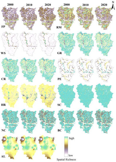 As shown in Figure 8, the higher the richness, the greater the ESV in the region. The richness of RW decreased obviously in the north of Luanhe River, while the richness of FP increased significantly in this same region. The area of water bodies had little change and the richness of WS varied scarcely, but the HR richness weakened noticeably especial in the part of the mainstream of Luanhe River and its tributaries. The richness weakening of GR, CR, NC and BC was quite obvious, especially in the area where orchard and mining land sprawled violently. The richness of SC declined slightly in the north, and the richness of PE and AL had no evident changes.