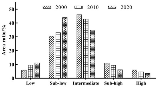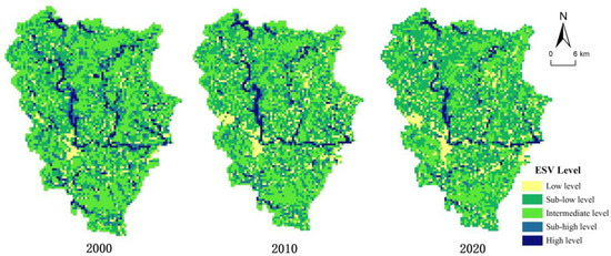 To better display the spatial distribution and the evolution characteristics of ESV, the reconstructed ESV was divided into five levels using the natural breakpoint method in ArcGIS: Low level (0–0.38 million CNY), Sub-low level (0.38–0.53 million CNY), Intermediate level (0.53–0.63 million CNY), Sub-high level (0.63–0.72 million CNY) and High level (0.72–0.99 million CNY) (Figure 9). The High level was mainly concentrated in water bodies, including forests along rivers and some high-altitude forests with less human activities, but it declined much during the past 20 years. The whole ESV level was weakening, for the transformation of High to Sub-high, Sub-high to Intermediate, Intermediate to Sub-low, and Sub-low to Low was continuing (Figure 10).