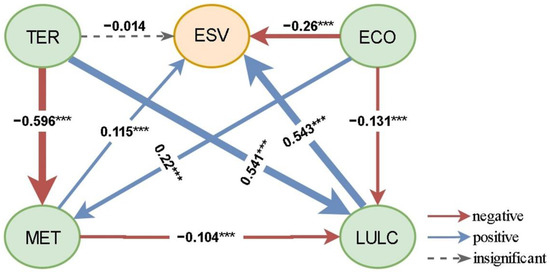 The structural equation model for the effects of different factors on ESV. *** indicates passing the 0.001 significance test.
