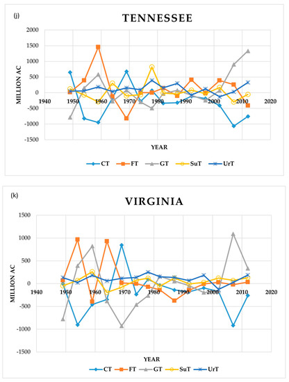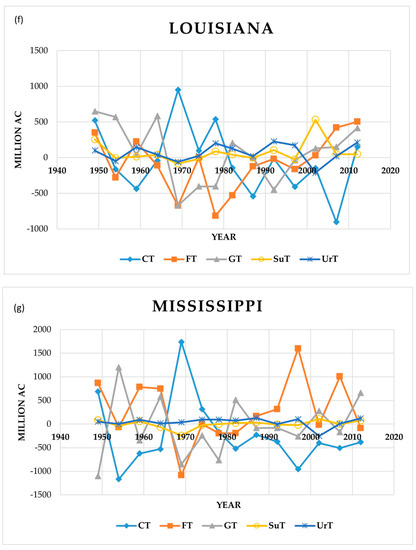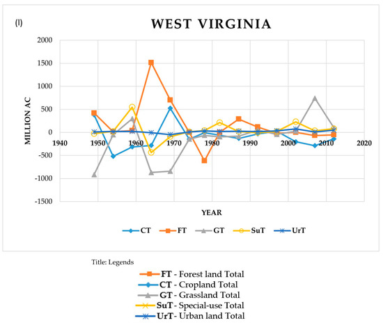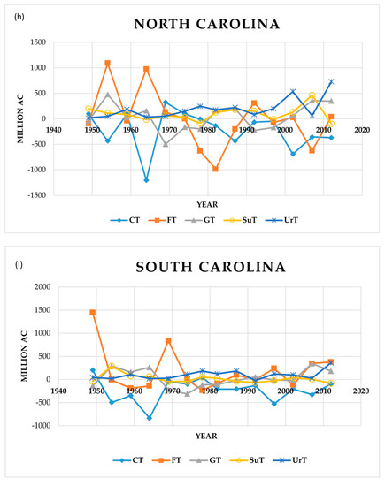 - Land-type data were collected from excel files from the Economic Research Service (ERS.) USDA website, retrieved from https://www.ers.usda.gov/data-products/major-land-uses/major-land-uses/ (accessed on 8 December 2022). The data showed acreage data in the form of “millions of acres”.
