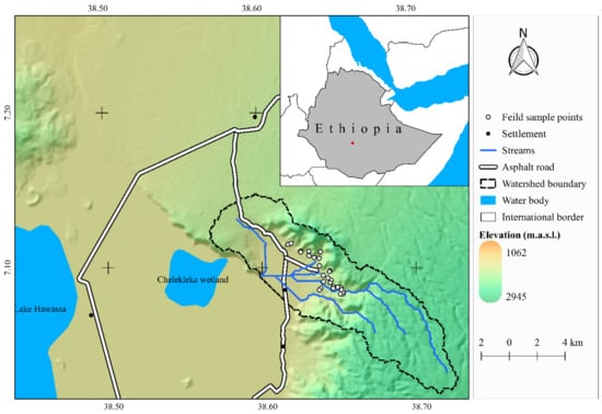 The study was conducted in Wondo Genet sub-catchment, which used to be an intact forest some decades ago [22]. The mountain ranges are sources of streams that drain to the Chelekleka wetland and then to Lake Hawassa. Therefore, the catchment is an important terrestrial ecosystem that connects tourism, agriculture, urban livelihoods and ecosystem services including biodiversity conservation.
