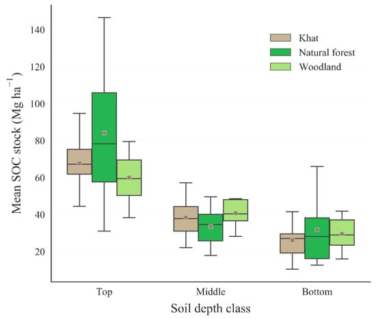 The study results indicated that there was more SOC at the top layer in the natural forest than in the woodland and khat plantation (Table 6). This could be related to the level of disturbance in the land use types. The natural forest is relatively less disturbed and has more inflow of organic matter that increased the SOC at the top layer. The uncertainty in estimates of SOC at the top layer in the sample plots of the natural forest was also larger than that of the woodland and khat plantation (Figure 2), which might be associated with the topographic variation that resulted in microclimate variability and soil organic matter distribution. More SOC accumulates in the gorges while ridges have low SOC. However, the differences in SOC levels among the land use types were not statistically different (Figure 2). This shows the stability of SOC among land-use types. Among the variables explored in this study, only soil depth was the main factor that explained the variability in mean SOC estimates in the current study (Figure 2; Table 7). The topsoil had significantly larger SOC than the middle and bottom layers, the latter of which were not statistically distinct from each other (Table 7).