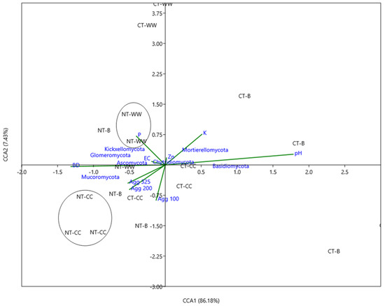 - Ceja-Navarro, J.A.; Rivera-Orduña, F.N.; Patiño-Zúñiga, L.; Vila-Sanjurjo, A.; Crossa, J.; Govaerts, B.; Dendooven, L. Phylogenetic and Multivariate Analyses To Determine the Effects of Different Tillage and Residue Management Practices on Soil Bacterial Communities. Appl. Environ. Microbiol. 2010, 76, 3685–3691. [Google Scholar] [CrossRef] [PubMed]