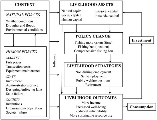 Much research has been done on livelihood strategies and the analytical framework is well developed. The UK Department for International Development’s (DFID) sustainable livelihoods framework is the most commonly used for livelihood analysis [40]. This framework has been used by many scholars to study the livelihood strategies of various groups. Mazzone [41] examines the impact of energy use on the diversification of livelihoods in the Brazilian Amazon from two decentralized systems of renewable and non-renewable sources. Su et al. [42] discussed livelihood strategies for tea farmers, and called for building partnerships between tea farmers and tourists to enhance the integration of tea and tourism, promote the participation of local tea farmers and increase incomes, especially for those with low livelihood assets. Based on existing research, Winters et al. [43] developed a framework for analyzing households’ livelihood strategies to measure their livelihood assets, activities and outcomes. For this study, the details of these frameworks need to be revised to suit the specific context of fisheries, fishers and fishing villages. However, whether it is the fishermen, the fishing industry or the fishing village, it is not an about individuals but a socio-ecological system [44]. The subsystems of fisheries resources, fisheries management, and fisheries fishing interact with each other in the broad social, political and economic context of the external environment [9]. Most importantly, these mentioned theoretical frameworks provide the knowledge base for the development of a framework for fishermen’s livelihood strategies.
