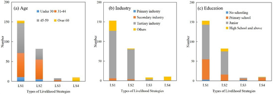 Figure 3 shows that the largest number of fishermen chose LS1. In terms of age, the majority of them are between 30 and 60 years old (89%); in terms of employment direction, they are mainly working in the tertiary sector (79%); and in terms of education level, most of them were categorized as primary and middle school (92%). One of the most interesting observations is the group of 82 fishermen in livelihood category LS2. Their areas of business are mainly in the tertiary industry too. However, the average level of education of this group of fishermen is higher than that of people who chose LS1. Only eight fishermen chose to take up public welfare positions (LS3); this is because such positions are funded by the village council and their primary purpose is to protect the livelihood of low-income and disabled groups. A group of 10 fishermen have chosen to retire (LS4). They are all over 60 years old, in poor health and with low levels of education, making it difficult to find suitable positions for them in the job market. Therefore, retirement is a good option for them, after a lifetime of hard work.