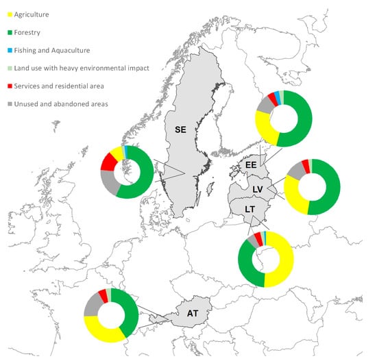 Functional land use (land-use types) according to Eurostat data (2015) in selected European countries (LV—Latvia, LT—Lithuania, EE—Estonia, AT—Austria, SE—Sweden) [].