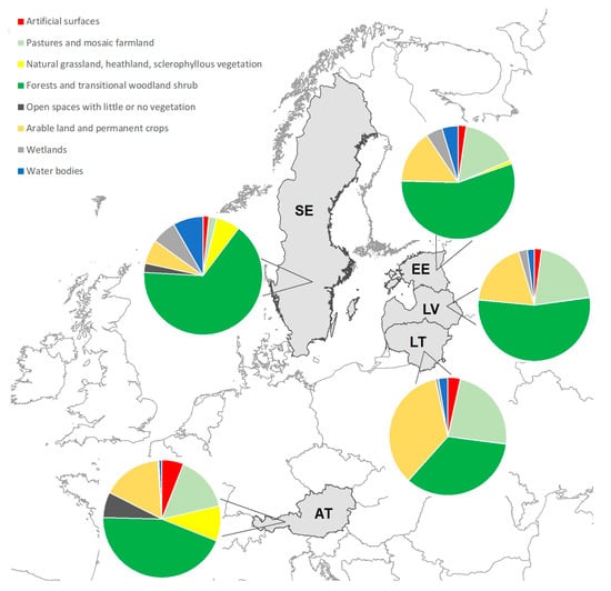 Land cover (land-use categories) according to EEA data (2018) in selected European countries (LV—Latvia, LT—Lithuania, EE—Estonia, AT—Austria, SE—Sweden) [].