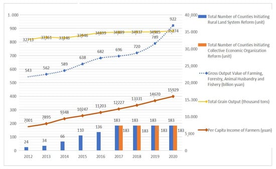 Rural reform and the trend of agricultural growth in Sichuan since 2012. Note: 1. The number of counties initiating the rural land system reform, the number of counties initiating the collective economic organisation reform and the gross output value of farming, forestry, animal husbandry and fishery on the left axis. 2. Total grain output and per capita income of farmers on the right axis.