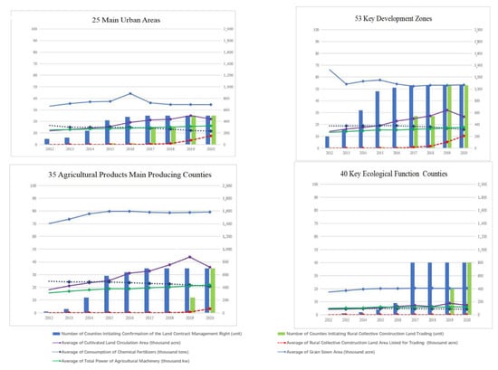 Trends of indicators in promoting rural land system reform in 4 categories of counties. Note: 1. The number of counties initiating confirmation of the land contract management right, the number of counties initiating rural collective construction land trading, arable land circulation area, collective construction land area listed for trading and chemical fertiliser consumption are on the left axis. 2. Grain sown area and total power of agricultural machinery are on the right axis.