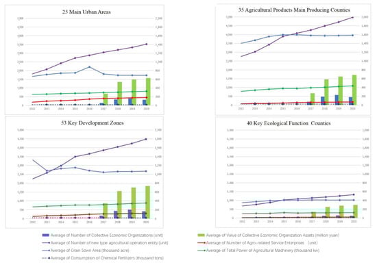 Trends of indicators before and after the reform of rural collective economic organizations in 4 categories of counties. Note: 1. Number of collective economic organisations, the value of collective economic organisations’ assets and the number of new types of agricultural operation entities are on the left axis. 2. Number of agro-related service enterprises, grain sown area, the total power of agricultural machinery and consumption of chemical fertilisers are on the right axis.