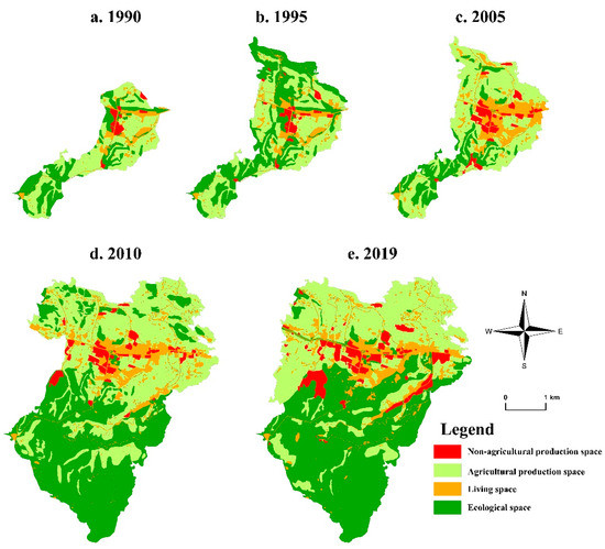 In the process of Zhulin’s development, not only has its leading industry changed, but its administrative area has expanded as well. This has led to a dramatic restructuring of the EPL space in Zhulin. To reflect the distribution structure of EPL space in Zhulin in different periods, we took 1990, 1995, 2005, 2010, and 2019 as time nodes and analyzed the transformation process of EPL space (Figure 4). In addition to the availability of data, we chose these time nodes because they are representative. Before 1994, Zhulin was only a village, not a town, so we chose 1990 to represent this period. In 1994, the administrative authority of Zhulin was changed from village to town, and its administrative area was expanded from 4.2 km2 to 6.4 km2. Therefore, we selected 1995 to reflect the early days of the establishment of Zhulin as a town. In 2006 and 2012, the administrative jurisdiction of Zhulin was expanded by 10.05 km2 and 10.15 km2, respectively, on the original basis. Therefore, we chose 2005 and 2010 as time nodes to reflect the time before the change in Zhulin’s administrative regions. In addition, we used 2019 to reflect the current time in Zhulin.
