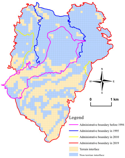 During 1990–2019, the area of the terrain interface expanded with the change in Zhulin’s administrative area, but its proportion of the administrative area did not change much (Figure 7). Accordingly, we obtained the location entropy of various types of spatial transfer that were within the terrain interface in different periods.