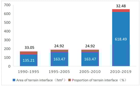Characteristics of changes in the number of terrain interfaces in Zhulin, 1990–2019. Note: The administrative area of Zhulin did not change during 2005–2010, so the area and proportion of terrain interfaces are the same as during 1995–2005.