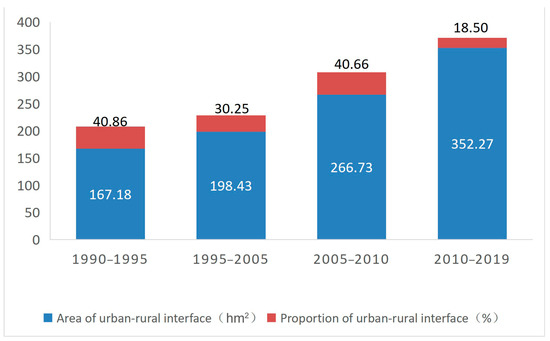 During 1990–2019, with the continuous development of Zhulin, its urban–rural interface area also expanded, but with the continuous expansion of Zhulin’s administrative area, the ratio of the urban–rural interface area to the administrative area fluctuated (Figure 8). Accordingly, we obtained the location entropy of various types of spatial transfer that were within the urban–rural interface in different periods.