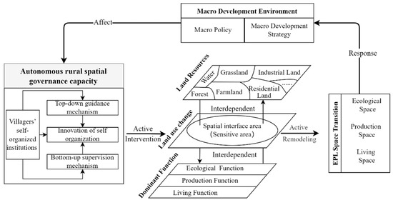 Studying land use transition and restructuring has value for promoting sustainable regional development, especially in China’s vast rural areas, which are undergoing rapid changes. Current research tends to focus on the macro level, and analyses of driving forces are mostly based on the correlation analysis of influencing factors. However, in the case of villages and towns, which are at the micro level, it is important to know who promotes land use transition and how to promote it under the influence of the macro environment. This study, therefore, focused on the endogenous driving force behind land use transition and its characteristics at the micro level of villages and towns. On the basis of our theoretical framework, an empirical study was carried out on the transformation and restructuring of ecology–production–living (EPL) spaces in the town of Zhulin in Central China over the past 30 years. We found the following: (1) The overall distribution of EPL spaces in Zhulin shifted from mixed distribution to relatively concentrated distribution, and the spatial transfer of EPL spaces showed fluctuations in the expansion and contraction of different types of spaces. (2) Land use transition was more active in spatial interface areas than in noninterface areas, where the interconversion of ecological space and agricultural production space was concentrated at the terrain interface. In addition, transformation processes related to living space and non-agricultural production space were concentrated at the urban–rural interface. (3) Macro-level social and economic changes were the root cause of land use transformation, and the autonomous spatial governance capability of villagers’ self-organization institutions was key to regulating land use transformation. The spatial interface was a sensitive area for land use transformation in a natural state. An endogenous driving mode of active response to land use transformation based on rural autonomous spatial governance capability and spatial interface sensitivity is proposed. How to improve the rural governance capacity of key local actors in different regions and at different levels is an aspect worthy of further consideration.