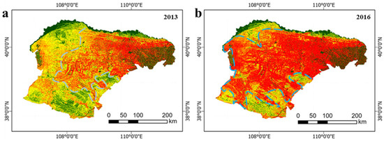 In Section 4.4, we show the changing trend of soil erosion in the Ordos, and we can find that the trend of soil erosion in most areas of Ordos is declining to different degrees. The main reason is related to the increasing vegetation coverage year by year. Increasing vegetation coverage can reduce the soil erosion caused by rainfall to a certain extent and enhance the service capacity of soil and water conservation.