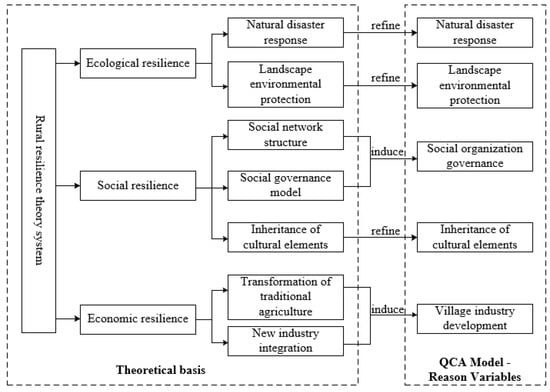 In this work, we utilized all of the above methods with reference to the literature to select variable conditions. We reached five reason variables (Figure 4) from three levels of ecological resilience, social resilience, and economic resilience according to the correspondence between the number of research samples and the number of variables [33,34] (Table 2) in the QCA of fuzzy sets. These mainly included: (1) natural disaster response (simplified as “ZRZH”); (2) landscape (environmental) protection (JGHJ); (3) social organization governance (SHZZ); (4) cultural element inheritance (WHYS); and (5) village industry development (CLCY). The outcome variable was the level of protection and development of traditional villages (BHFZ).
