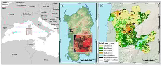 Location of the study area. (a) Location of Sardinia region (Italy). (b) Focus map of the region with the location of the study area. The image superimposed on the map shows in false colors (based on NIR, red, and green bands) a detail of the area struck by the megafire. (c) A map of land use types in the study area. The reference system is WGS84–UTM.