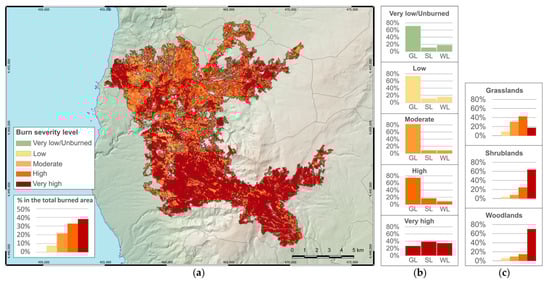 Considering the distribution of the severity levels within the vegetation types, the burned woodlands and shrublands were mainly affected by very high severity with 70.0% and 64.0% of the respective burned area, while only 17.6% of the burned grasslands were affected by the highest severity level.