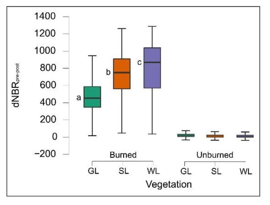 Boxplot of dNBRpre-post values in burned and unburned grasslands (GL), shrublands (SL), and woodlands (WL). The boxes show the interquartile range, horizontal bars show median values, and vertical bars show the top and bottom 25% quartiles.