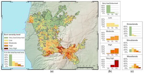Post-fire burn severity (dNBRpre-post) in the study area. (a) Map of burn severity levels. The histogram in the map shows the percentage distribution of severity levels in the total burned area. The reference system is WGS84–UTM. (b) Percentage distribution of severity levels among grasslands (GL), shrublands (SL), and woodlands (WL). (c) Percentage distribution of severity levels within the vegetation types.