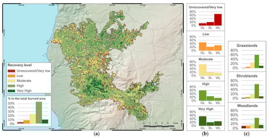 Spectral recovery levels one year after the fire (dNBRpost-1yr). (a) Map of recovery levels. The histogram in the map shows the percentage distribution of recovery levels in the total burned area. The reference system is WGS84–UTM. (b) Percentage distribution of recovery levels among grasslands (GL), shrublands (SL), and woodlands (WL). (c) Percentage distribution of recovery levels within the vegetation types.