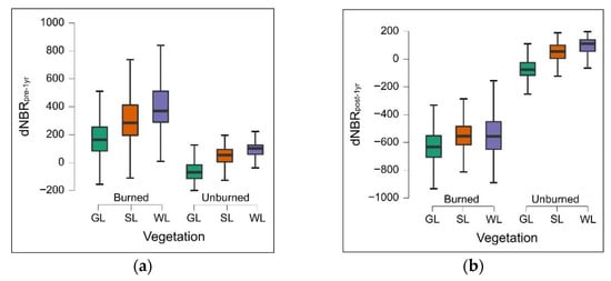 Boxplots of (a) dNBRpre-1yr and (b) dNBRpost-1yr values in burned and unburned grasslands (GL), shrublands (SL,) and woodlands (WL). The boxes show the interquartile range, horizontal bars show median values, and vertical bars show the top and bottom 25% quartiles.