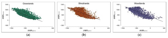 Scatterplots of dNBRpre-post and dNBRpost-1yr correlations for (a) grasslands, (b) shrublands, and (c) woodlands.