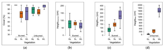Boxplots of percent coverage, Heightresprouts, and Heighttotal. (a) Boxplot of percent coverage in burned and unburned grasslands (GL), shrublands (SL), and woodlands (WL). (b) Boxplot of Heightresprouts and (c) Heighttotal in burned vegetation. (d) Boxplot of Heighttotal in unburned vegetation. The boxes show the interquartile range, horizontal bars show median values, and vertical bars show the top and bottom 25% quartiles.