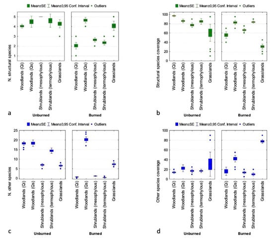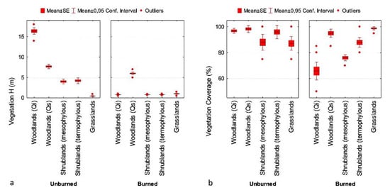 To obtain a more detailed picture of the vegetation response during the first growing season after the fire, field surveys were carried out at a smaller spatial scale in burned and unburned areas. Inside the same plots used to validate spectral recovery, more detailed vegetation data was recorded: specifically, in addition to the mean height and percentage of coverage, a detailed floristic checklist per plot was compiled and, for structural and diagnostic plant species of each vegetation type, the mean height and relative percentage of coverage were measured. Structural and diagnostic species were identified according to the Italian Interpretation Manual of EU Habitats [66]. In order to optimize the surveys considering the wide extension of the burned area, which embraced a wide altitudinal range and a wide variety of ecological conditions (therefore, various vegetation series), the woodland formations were distinguished on the basis of the dominant tree species (Q. ilex vs. Q. suber), the shrubland formations into two subcategories (thermophilus vs. mesophilus), and grassland formations were considered a single category. The differences between burned and unburned plots for each parameter and vegetation type were statistically analyzed through the Mann–Whitney U test. All the analyses were carried out using the Statistica 8.0 software (Statsoft, Tulsa, OK, USA).