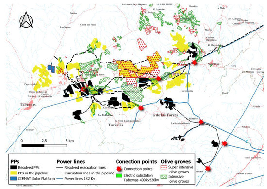 PPs and evacuation lines resolved and in the pipeline, connection points, and super-intensive and intensive olive groves. La Ribina substation and the power lines (220 kv and 400 kv) that converge at Tabernas substation are not shown for clarity.