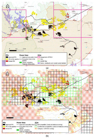 - ICAs. To evaluate the overlap of PPs with Priority HCIs, we used the unique HCI layer available at [35]. This layer represents the basic official cartography on the potential distribution of HCIs in Andalusia. For this study, we distinguished among approved, denied and in the pipeline PPs.