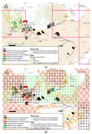 Overlapping between ICAs and approved PPs without expert allegations, definitely rejected PPs, momentarily rejected PPs after expert allegations, and modified PPs before (original location) and after expert allegations. Approved evacuation lines and evacuation lines rejected after allegations. (a) Guide for the assessment of the repercussions of solar installations on steppe bird species (MITECO 2021) and strategies for the conservation and recovery of endangered species (MITECO 2022c), recovery plans for endangered species of the Junta de Andalucía, namely AASBR and Dunes and coastal sandy habitats (Junta de Andalucía 2022a), and IBAs. (b) Zoning carried out by MITECO and Junta de Andalucía. Neither the Plan for the Improvement of Ecological Connectivity nor the HCIs are represented since the overlap with PPs is very high (100% and 67.7% respectively) and would make it difficult to understand the figure.