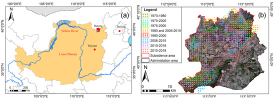 Locations of (a) the Yungang mining area within the Loess Plateau of China and (b) the distribution of the subsidence area. The boxes with years in legend represent the durations of mining activities occurring in each area.