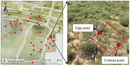 (a) The distribution of ground fissures in a subsidence area, and (b) illustration of the edge point and contrast point of one ground fissure. The red squires in (a,b) represent the sample points, including both edge and contrast points, at each investigated ground fissures.