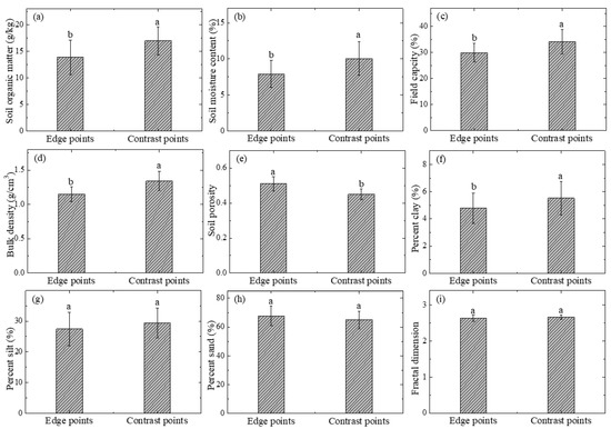 The soil properties of edge and contrast points at ground fissures. (a) Soil organic matter; (b) soil moisture; (c) field capacity; (d) bulk density; (e) soil porosity; (f) percent clay; (g) percent silt; (h) percent sand; (i) fractal dimension. Note: Different letters indicate significant differences among the two points at p < 0.05 based on Duncan’s multiple range tests.