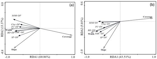 Changes in soil properties is closely related to the width, slope, and vegetation coverage of the ground fissures. In this research, the positive correlation between the changes of soil properties at the edge points with the width and slope of ground fissures, along with the negative collection with vegetation coverage (Table 2 and Table 3) could be caused by the increase in the slope of the ground fissures accelerating the speed of precipitation runoff, which intensifies soil erosion. The increase in width intensifies air flow on the fractured slope surface, leading to an increase in the rate of water evaporation; it also strengths the ability of ground fissures in intercepting runoff, enabling more water with nutrients to penetrate into deep soil [35]. Conversely, increased vegetation coverage around the cracks enhances the soil’s ability to retain water and fertility as well as to slow the speed of runoff from rain, preventing an increase in soil erosion [36]. The RDA results show that vegetation coverage is the most important factor in determining the changes of soil properties, and it is closely related to the Si_DP. However, the cumulative explanations of the total variation of Si_DP (74.81%) and Si_DV (49.6%) via selected characteristics of ground fissures were relatively low, indicating that there could be other factors influencing the changes of soil properties. In previous research, the density of ground fissures within an area was also considered as a factor that influenced soil properties [25]. This indicated that the interaction between adjacent ground fissures and changes in regional terrain could also affect soil properties. A lower correlation of Si_DV with ground fissures than that of Si_DP also indicated the initial soil properties can also influence the level of changes in soil properties, and thus a pre-survey on basic soil properties of the area with ground fissures should be performed before land reclamation and ecological restoration.
