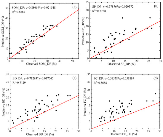 The coefficients of determination of linear fitting model, random forest model and BP neural network model for quantitative relationships between ground fissures and changes in soil properties are shown in Table 4, while the accuracy performance of BP neural network model are shown in Figure 5. The BP neural network model for prediction of the SOM_DP has the highest accuracy (R2 = 0.8867) (Figure 5a), followed by the prediction of SP_DP (Figure 5b), BD_DP (Figure 5c), FC_DP (Figure 5d), SMC_DP (Figure 5e), and Clay_DP (Figure 5f).