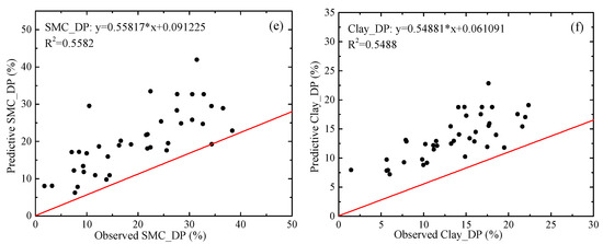 Accuracy performance of BP neural network model for quantitative relationships between ground fissures and changes in soil properties. (a) SOM, soil organic matter; (b) SP, soil porosity; (c) BD, bulk deny; (d) FC, field capacity; (e) SMC, soil moisture content; (f) Clay, percent clay; DP, the percentage of the difference.