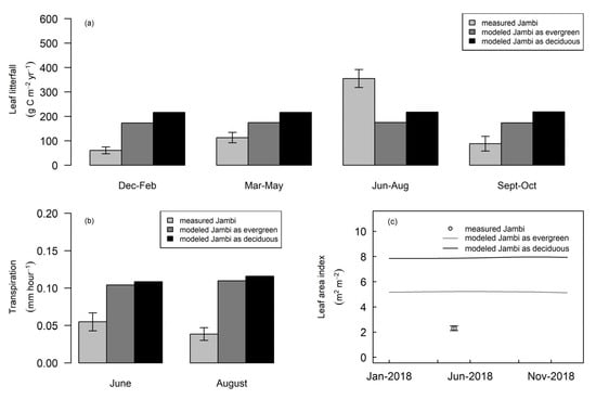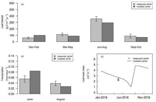 Seasonal trends of leaf litterfall (a) of rubber plants simulated by CLM (modeled using standard tropical evergreen parameters or standard tropical deciduous parameters) and measured values (bars are standard errors (n = 4 plots) during the mature phase of growth of smallholder rubber plantations in Jambi, Indonesia. Measured (bars indicate the standard errors) and CLM simulated monthly transpiration rates of June and August (b), and monthly values of leaf area index (c) (simulated by CLM (black line), measured values (open circles)) of rubber plantation in Jambi, Indonesia, are also shown. The measured data are taken from published studies [34,63,64].