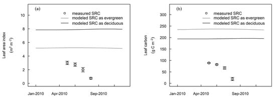 Measured (open circles, bars are standard errors) and CLM simulated (gray line, modeled using standard tropical evergreen parameters; black line, modeled using standard tropical deciduous parameters) leaf area index (a) and leaf carbon (b) of smallholder rubber plantations in 2013 in SRC, Indonesia. The measured data are taken from a published study [55].