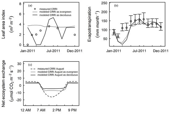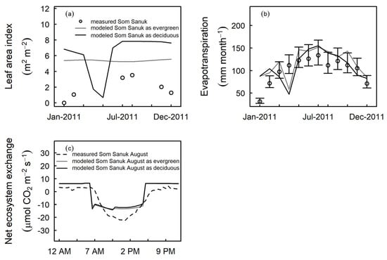 Monthly values of leaf area index (a) and evapotranspiration (b) of rubber plantations simulated by CLM (gray line; modeled using standard tropical evergreen parameters; black line, modeled using standard tropical deciduous parameters) and measured values (open circles; bars indicate the standard errors) during the mature phase of growth of rubber. Diel variations of net ecosystem exchange (c) of rubber plantations simulated by CLM (gray line, modeled using standard tropical evergreen parameters; black line, modeled using standard tropical deciduous parameters) and measured values (dashed lines) in Som Sanuk, Thailand, in 2009 are also shown. All of the measured data are taken from published studies [10] except for net ecosystem exchange, which is digitized from a leaflet (https://lcluc.umd.edu/sites/default/files/lcluc_documents/Fox_1.pdf, accessed on 12 December 2021).