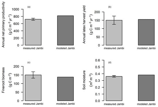 Measured (bars are standard error, n = 4 plots) and CLM-rubber (modeled using rubber parameters) net primary productivity (a), latex yield (b), fine root biomass (c), and soil moisture in the top 5 cm soil depth (d) of smallholder rubber plantations in 2013 in Jambi, Indonesia. The measured data are taken from published studies [42,65].